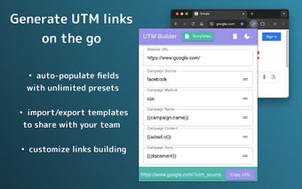 С легкостью создавайте, управляйте и отслеживайте маркетинговые URL-адреса с интуитивным интерфейсом UTM Builder. Воспользуйтесь функциями, такими как автоматическое создание URL-адресов, подробные аналитические отчеты и возможность обмена шаблонами между командами. Улучшите свои инструменты цифрового маркетинга и оптимизируйте производительность кампаний с помощью этого мощного расширения для Chrome.